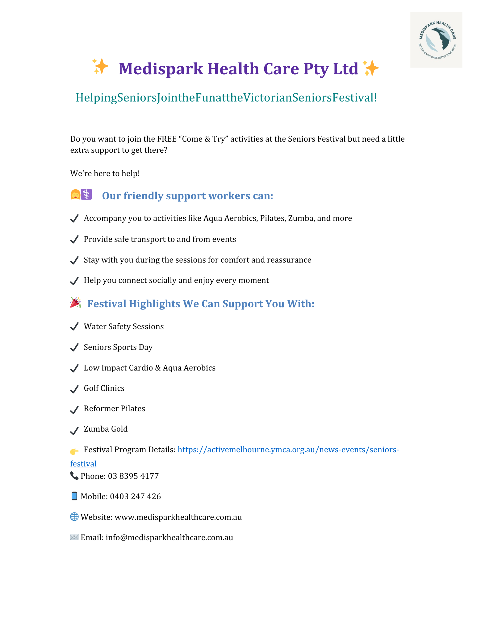 Community Activities Medispark_Seniors_Festival_Poster 2 Medispark_Seniors_Festival_Poster Victorian Seniors Festival 1–31 October 2025 details: https://activemelbourne.ymca.org.au/news-events/seniors-festival Medispark_Seniors_Festival_Poster 1 Area We Serve Melbourne Kensington Maribyrnong